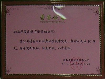 湖南华厦建筑劳务有限责任公司在四川大地震后捐赠